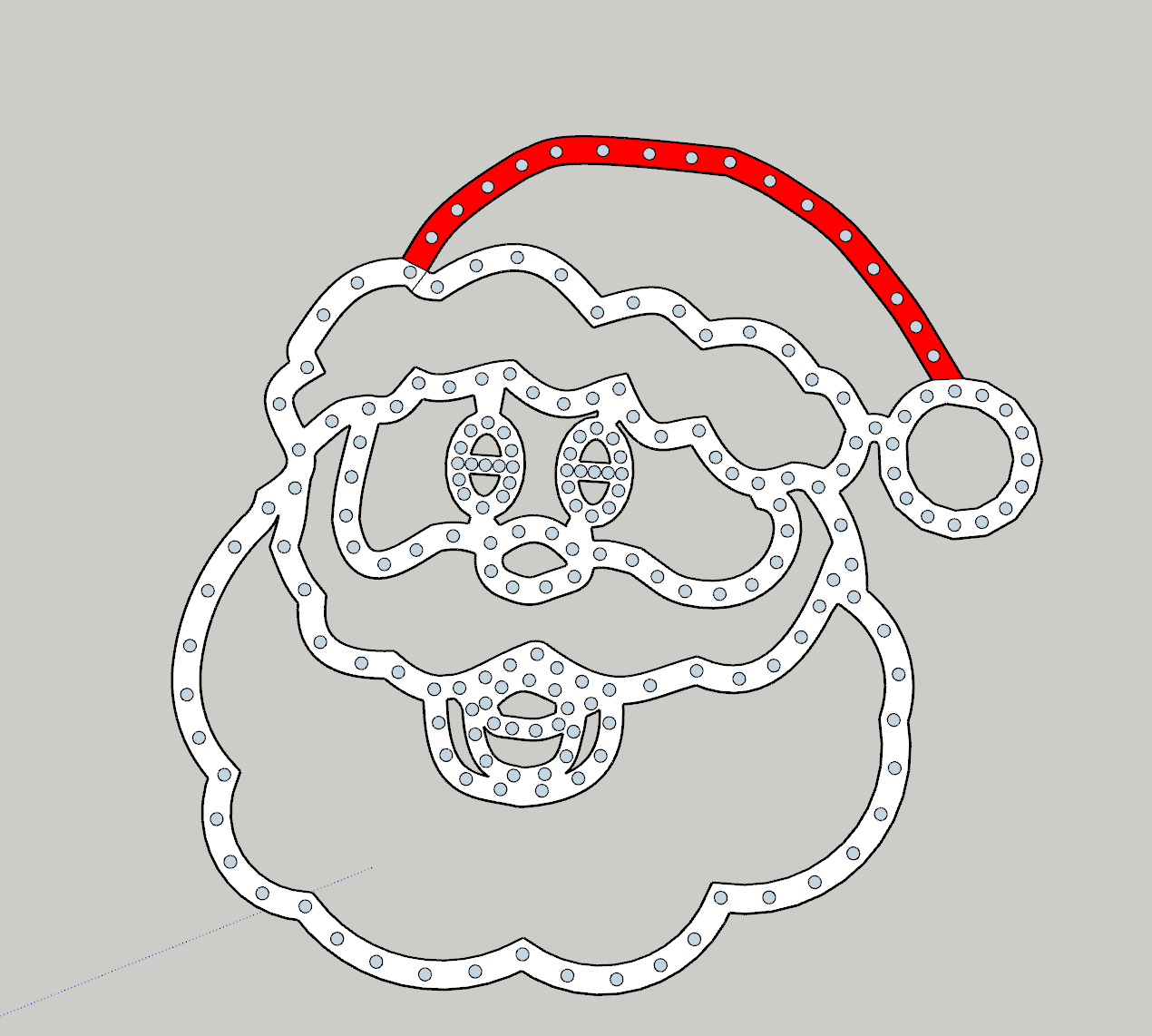 First - the props. In my last post, I left you with a picture of my 3D printed singing Christmas Tree and a view to make some new props. I started working on a similar layout to the singing Santa from Boscoyo albeit at a suitable size for the space it'll be mounted in. The process was similar to the Christmas tree - eyeball the layout from xLights, reduce the size to the space I wanted to occupy (around 60-70cm square) and draw in new 12mm holes for the bulbs to sit in.